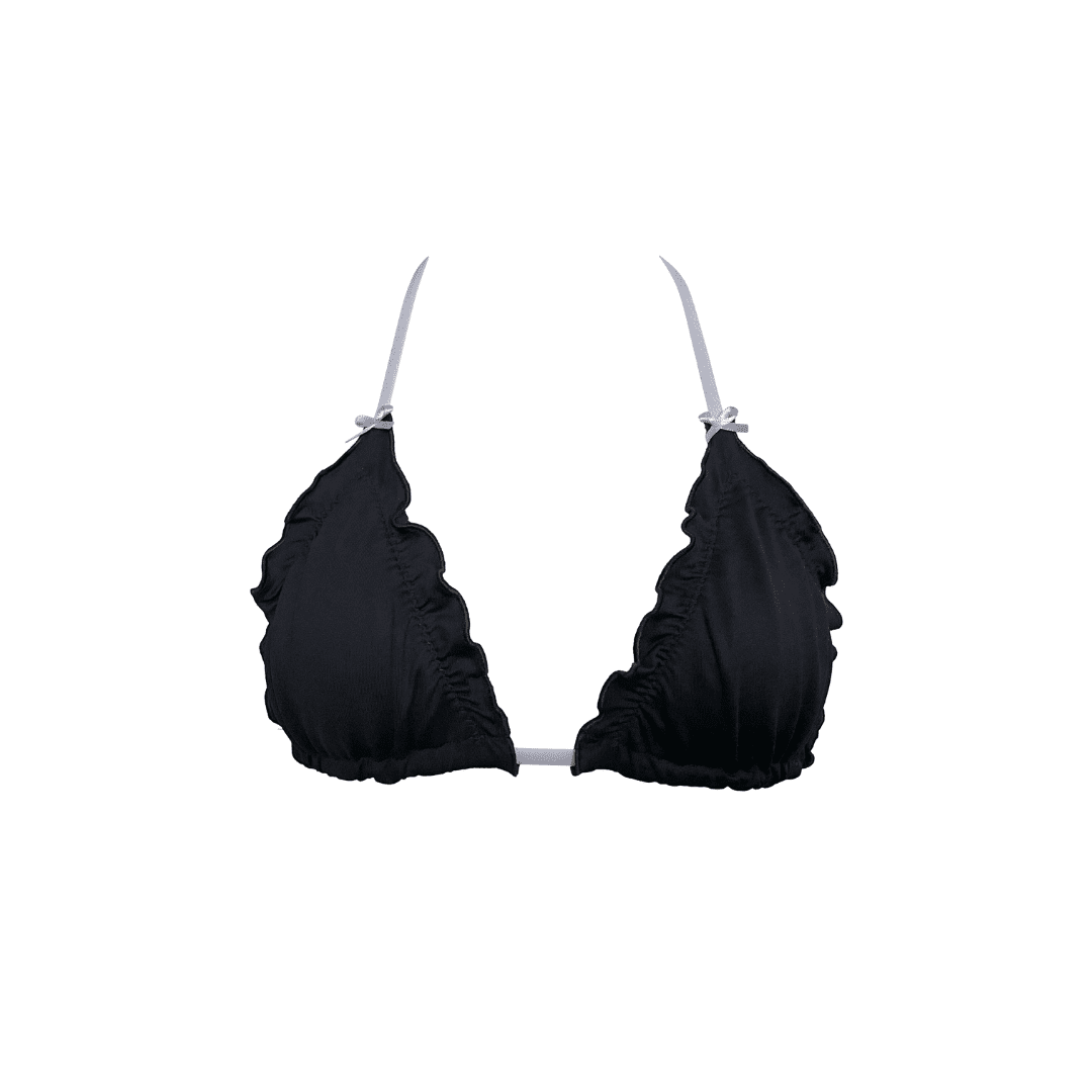 The new Amelia top is a playful twist on a classic triangle, featuring ruffled edges and two mini bow ties for a touch of charm. With adjustable coverage and a flattering fit, it's the perfect blend of femininity and versatility.