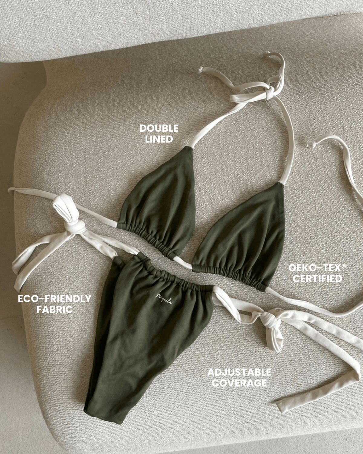 A Tranquila favourite, the Liv Top features a classic adjustable triangle silhouette in a gorgeous olive green shade perfectly paired with contrast white straps. Designed for a flattering, supportive, and customizable fit. Pair with the Liv Bottoms.